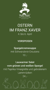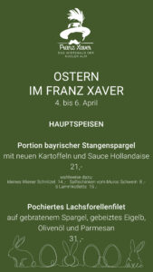 Während unserer Öffnungszeiten können Sie auch gerne im Wirtshaus Franz Xaver per Telefon reservieren. Vom 07. bis 28. Januar 2025 haben wir Betriebsurlaub.
