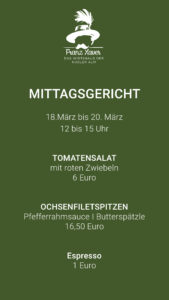 Mit unserer neuen Mittagskarte bieten wir Ihnen saisonale Gerichte der regionalen und internationalen Küche. Täglich von Mittwoch bis Freitag frisch für Sie zubereitet.